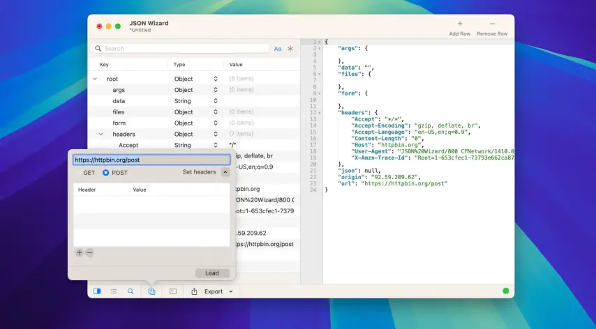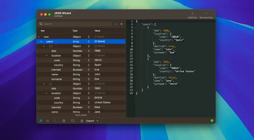 如果您只想查看和编辑 JSON 文件,JSON Wizard 是您的理想之选。或者,您可能希望能够导入 XML/YAML/PLIST/CSV 文件。您甚至可能希望能够导出为所有这些格式。