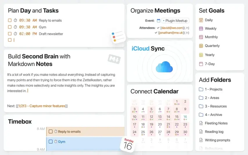 - 基于 Markdown 的注释,带有反向链接、标签和提及,以创建一个有凝聚力的知识库。