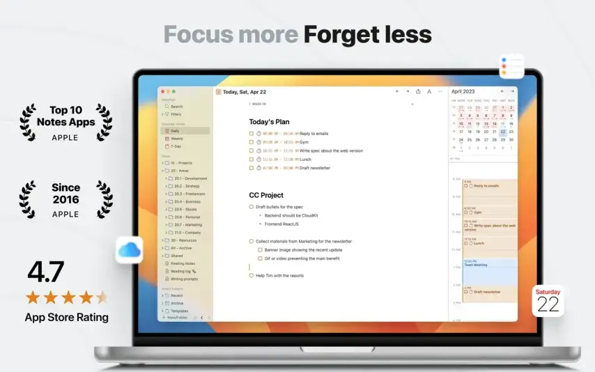 macOS 版 NotePlan 是一个统一的工作区,整合了日历、待办事项和笔记,让您在一个应用中即可同时使用所有功能。该应用支持纯文本文件和 Markdown 格式,还可以集成第三方日历。