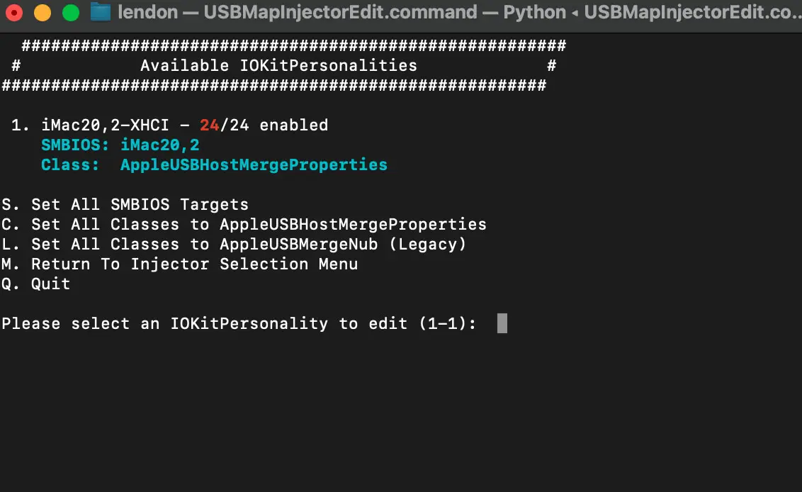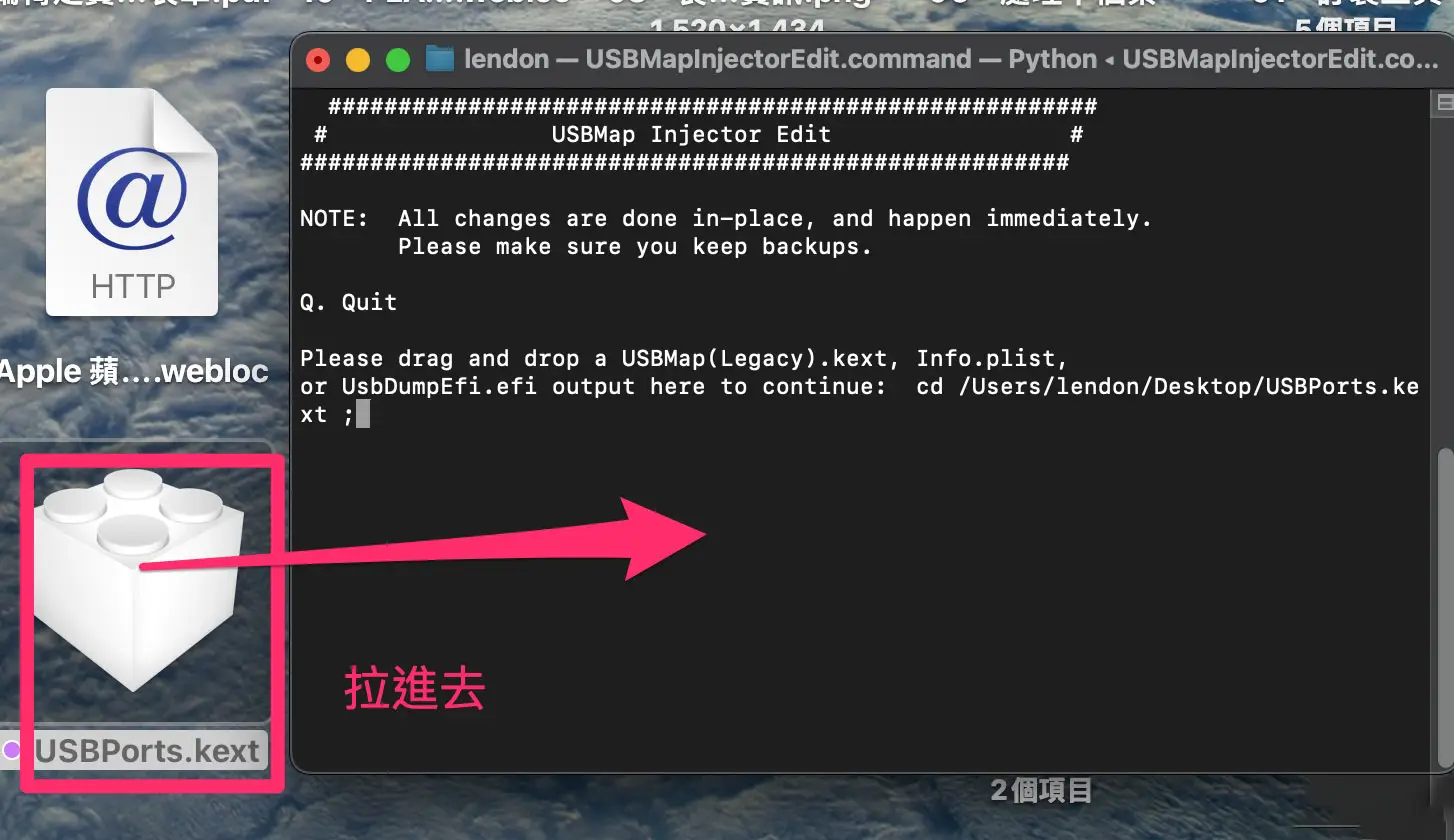 4.USBMapInjectorEdit.command双击打开后会叫你把你原先适用于旧版MACOS里头的USBMap.kext或订制档案里头的Info.plist拉进去,然后按下Enter.