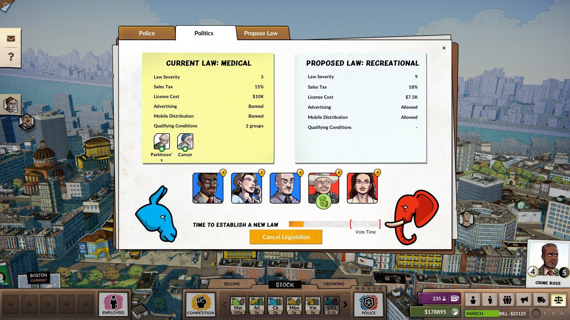 这个重要且极具争议性的话题在本作中得到了全面而专业的阐述。《大麻帝国》为那些想要掌控大麻帝国的玩家提出了挑战,提供了一系列形形色色的场景和形形色色的人物,供玩家在企业发展过程中选择合作或规避。为了不断壮大的帝国和企业利润,玩家需要为政客举办派对、贿赂警察、争取医用大麻的合法权益,并努力在法律框架内行事。