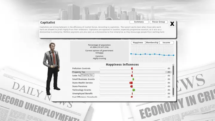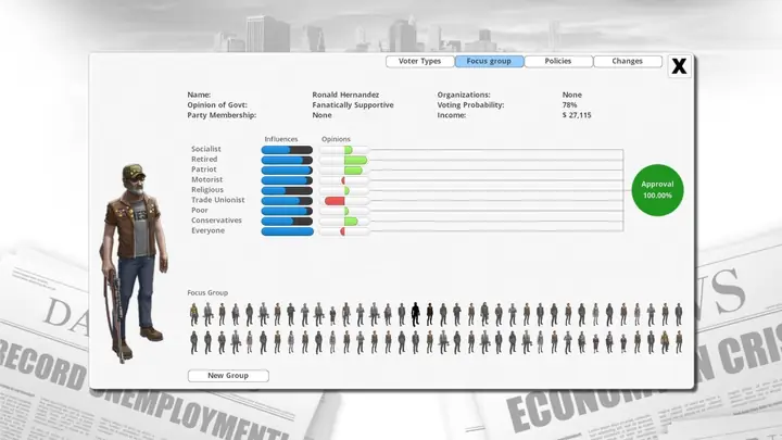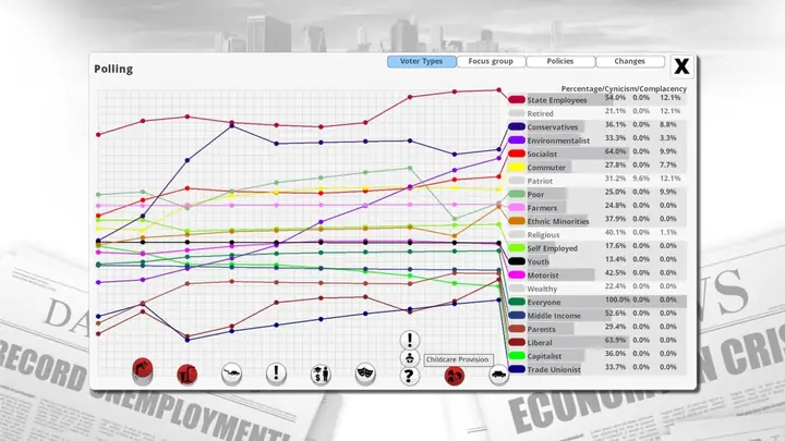 每个选民都是一个复杂的个体,其构成基于他们在游戏中21个选举群体中的子群体成员身份。例如,有一个名为“年轻、富裕、自由主义和社会主义选民,通勤族”的选民群体,或者“持有资本主义保守主义观点的退休宗教人士”。你的长期政治决策不仅会改变他们所属的特定群体,还会影响选民对这些群体的认同程度。通过谨慎周密地调整政策和法律,你最终可以将你的国家转变为一个宗教国家或无神论国家,一个资本主义国家或社会主义国家。“焦点小组”功能允许你研究单个选民的情绪,并了解他们为什么决定投票给你(或不投票给你)。