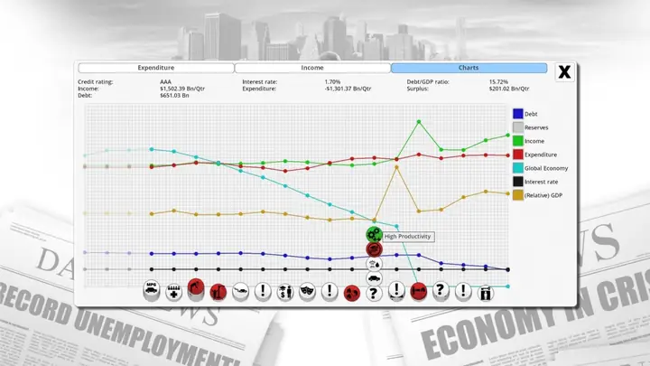 尽管隐藏着大量细节,但《民主3》的开发者们打造了一个极其人性化的界面,让用户能够轻松追踪法律、政治决策、选民情绪和突发事件之间的关系。政府以简化的图标形式呈现,使用户能够详细分析政治决策与选民情绪之间的关系,并快速评估其后果。贸易政策会影响国内生产总值(GDP),进而影响失业率,失业率会影响贫困率,贫困率又会影响犯罪率,犯罪率会影响一个国家对游客的吸引力,而游客的吸引力反过来又会影响GDP……
