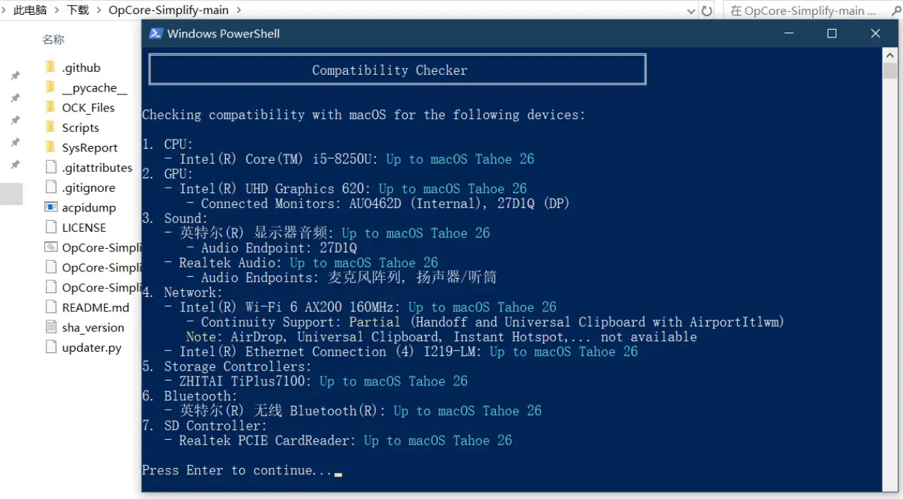 5、导出报告成功,显示了各个硬件信息以及支持的macos版本。按回车进入下一步(PS系统有不支持的硬件会提示)。