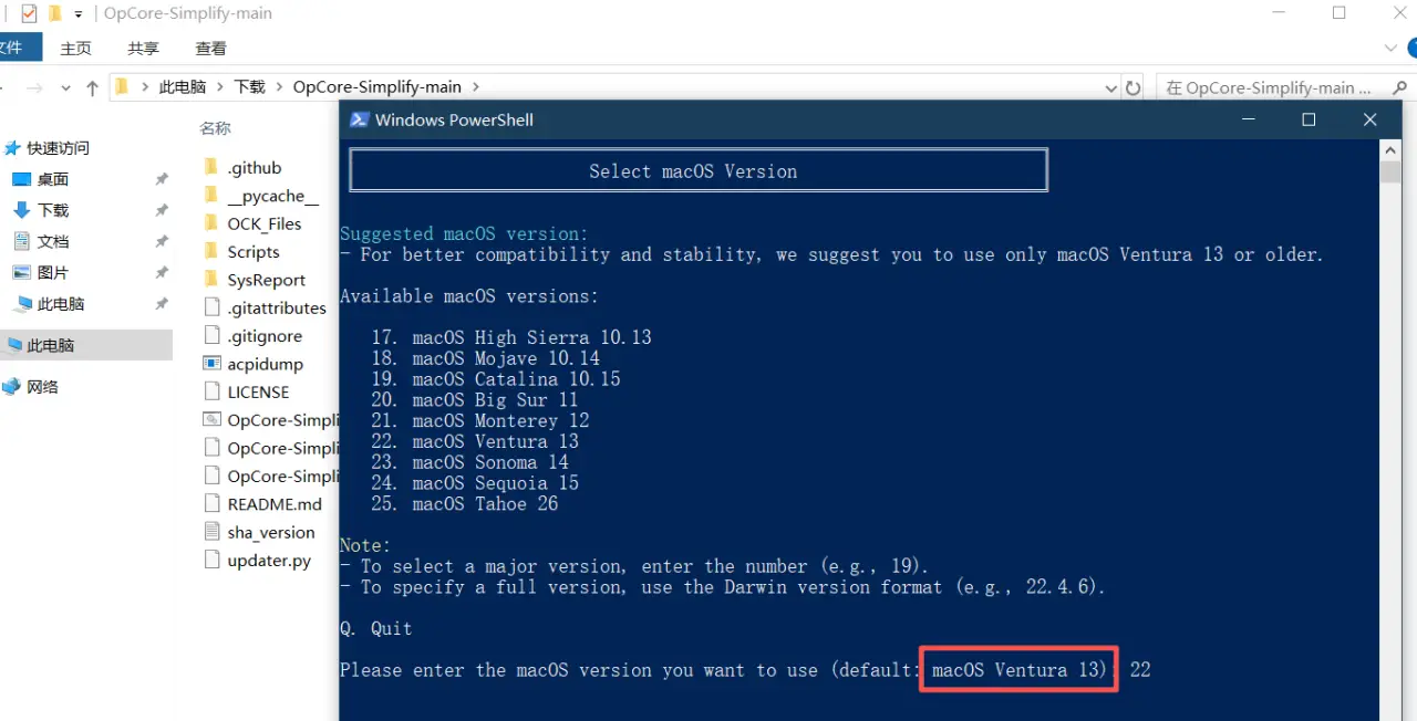 6、选择macos版本,我这里选脚本推荐的macos13,输入22后回车。