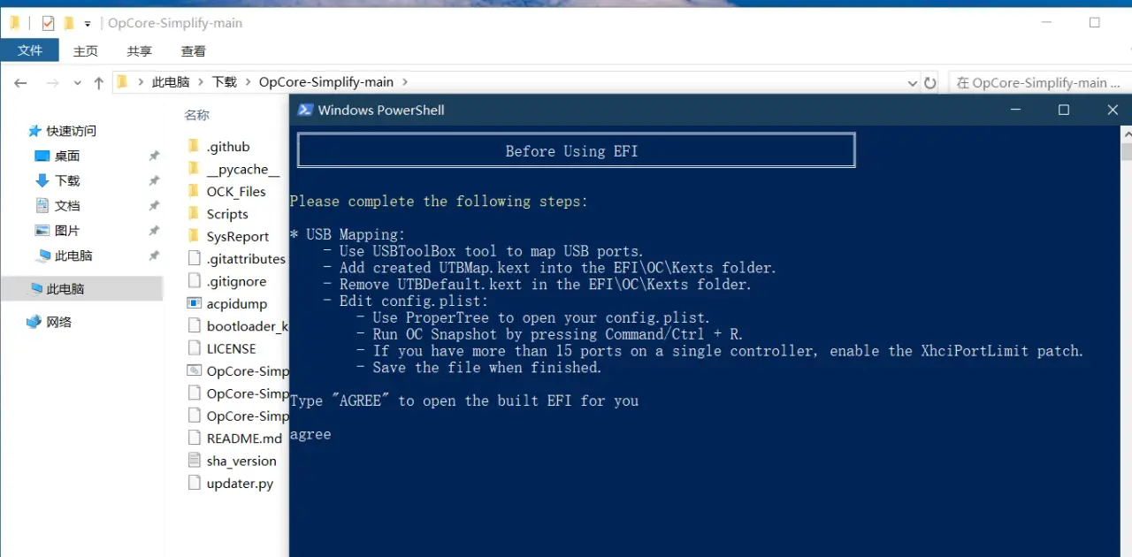 11、这里提示安装完成后还需要进行usb定制,输入agree打开EFI文件夹。