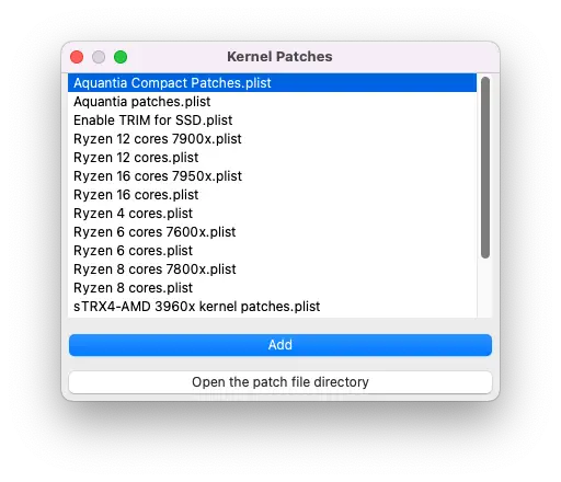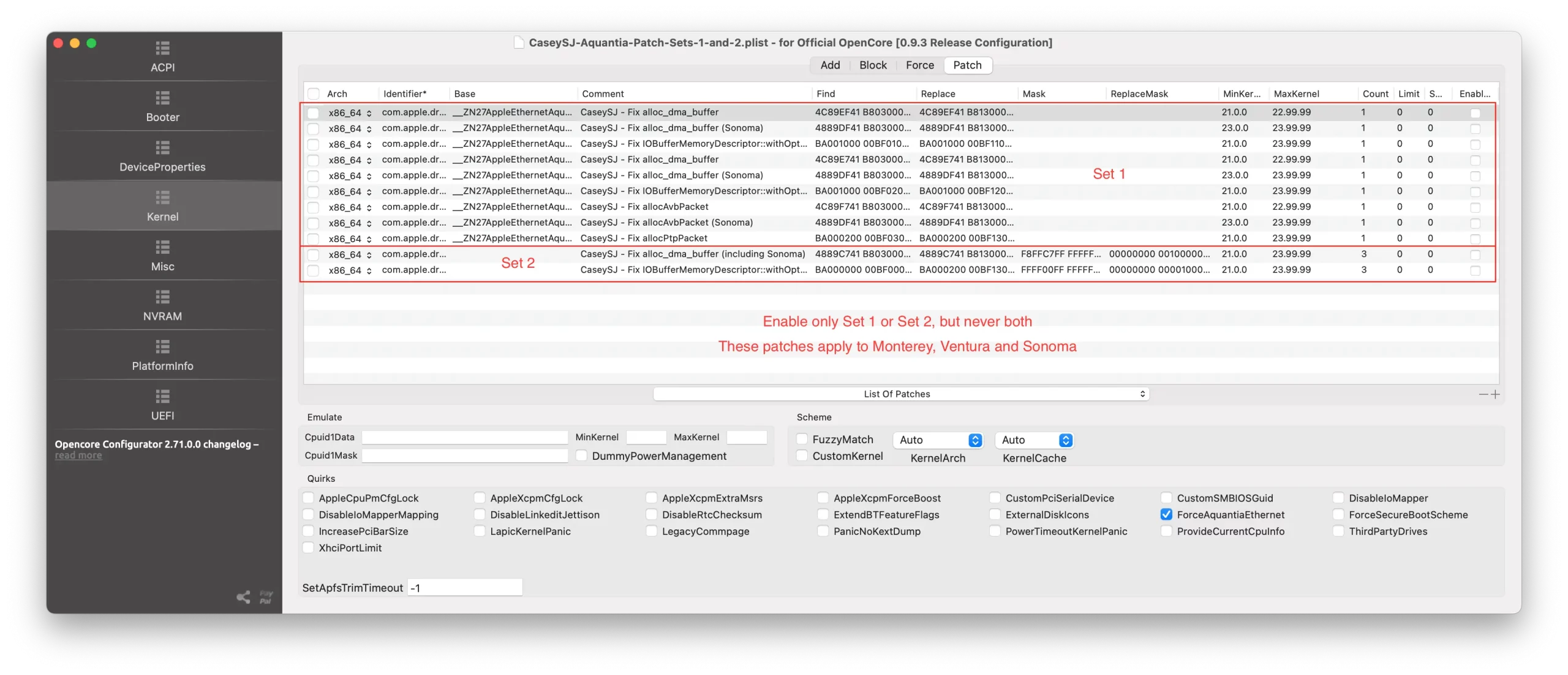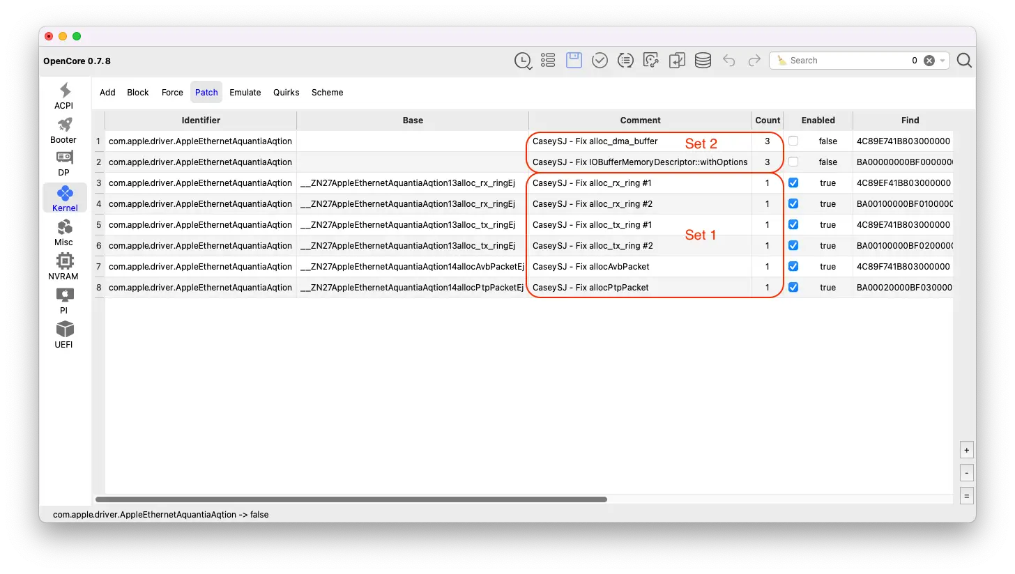 共有 11 个补丁.plist。前 9 个属于第一组,后 2 个属于第二组。您可以根据个人喜好选择使用第一组或第二组的补丁。请勿同时启用第一组和第二组的补丁。为了使 Aquantia 10GbE 网卡正常工作,必须启用同一组中的所有补丁。