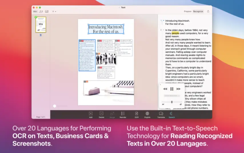 使用 Prizmo 强大的光学字符识别功能,将您的原始图像或扫描件转换为 23 种语言的易读文本。这款 Mac 扫描仪拥有强大的编辑功能、iCloud 支持以及 59 种语言的翻译功能,可轻松数字化任何尺寸的文档。Prizmo 还具备脚本管理和自动化等专业功能,可集成到您的自定义工作流程中。