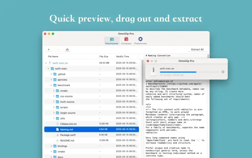 OmniZip 是一款功能强大的压缩工具,专为注重效率和安全性的用户而设计。凭借智能压缩算法、强大的加密功能和直观的界面,它是处理压缩文件的理想解决方案。