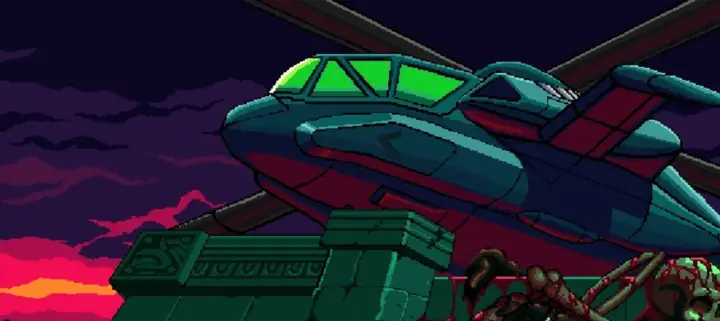 《巨型直升机》融合了 80 年代和 90 年代的经典复古游戏(直升机救援、沙漠/丛林/城市突袭)以及塑造我们的电视节目(飞狼、霹雳游侠),并加入了更新的游戏玩法和科幻冒险元素。