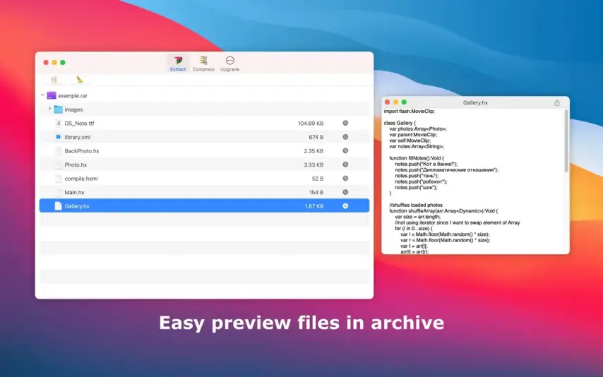 将压缩文件拖到 Dock 图标上即可直接提取或显示。