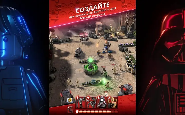 释放达斯·维达的原力打击来阻止你的敌人,用卢克·天行者的原力力量将他们击退,并发现尤达、波巴·费特和其他众多角色的各种能力。用必要的部队和防御塔提供支援,打造一支势不可挡的军队,将你的敌人彻底摧毁!