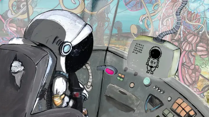在旅途中,这位机器人遇到了各种奇异的生物,例如蛾猫、西兰花动物、蝙蝠鳐、巨型触手植物,以及其他被困在这个星球上几个世纪而没有任务或目的的人工智能,这使得它们,嗯,可能有点怪异。