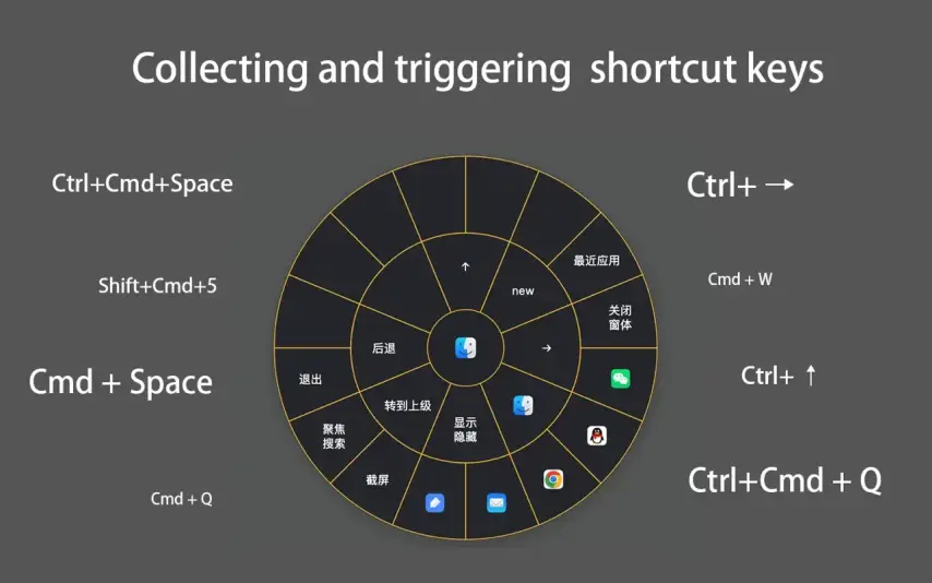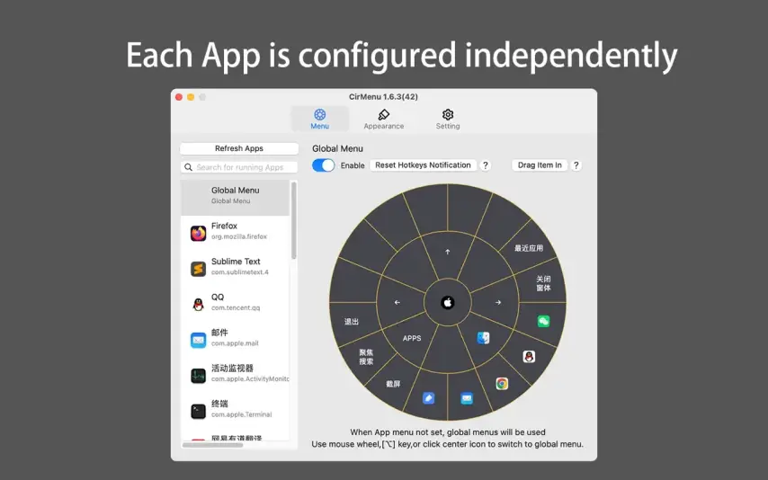 CirMenu 是一款实用工具,它提供环形菜单,可通过热键或触控板/鼠标手势快速访问应用程序、文件、链接和文本,允许您为每个应用程序自定义环形菜单,以便快速执行快捷方式和操作。
