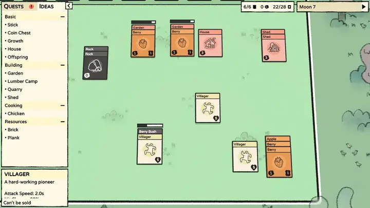 《Stacklands》是一款集换式卡牌游戏,以建造和管理为主题。玩家通过放置卡牌来收集食物、建造建筑和对抗敌人。例如,将村民卡牌拖到浆果丛卡牌上,即可获得一张新的浆果卡牌,村民可以食用这些浆果来维持生存!玩家还可以出售一些卡牌来赚取金币,然后用金币购买卡包。卡包中包含多个卡牌,每个卡包都围绕烹饪、耕作或建造三大主题。
