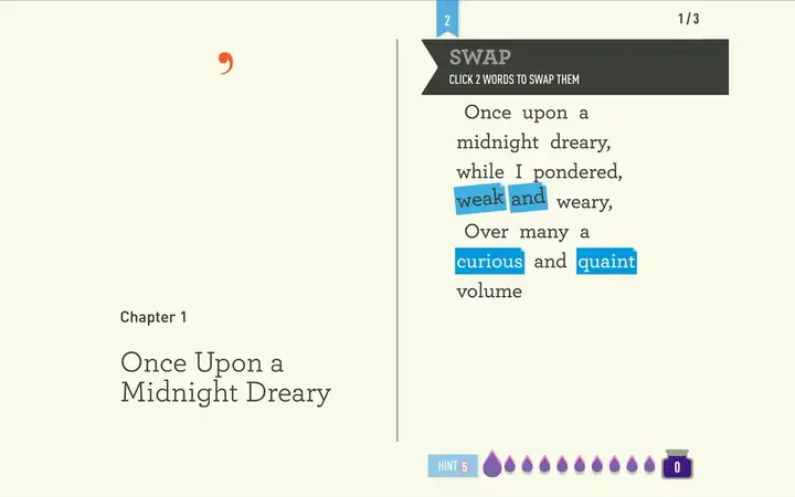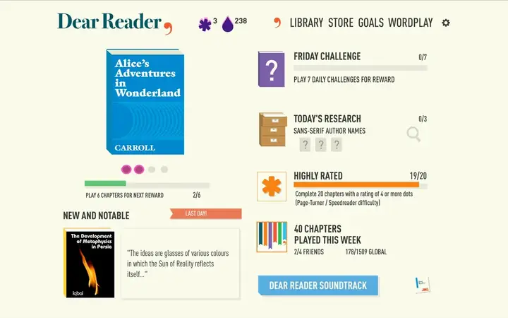 《亲爱的读者》是一款文字益智游戏。游戏中以页面形式展示经典小说和诗歌的节选,玩家需要完成诸如纠正词序或重新排列短语之类的任务。
