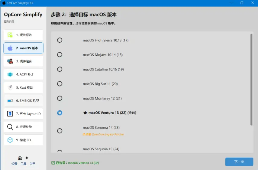 安装完成后如需使用OpenCore Legacy Patcher(OCLP),请直接应用Root Patch以激活如新款Broadcom Wi-Fi、显卡加速等功能。