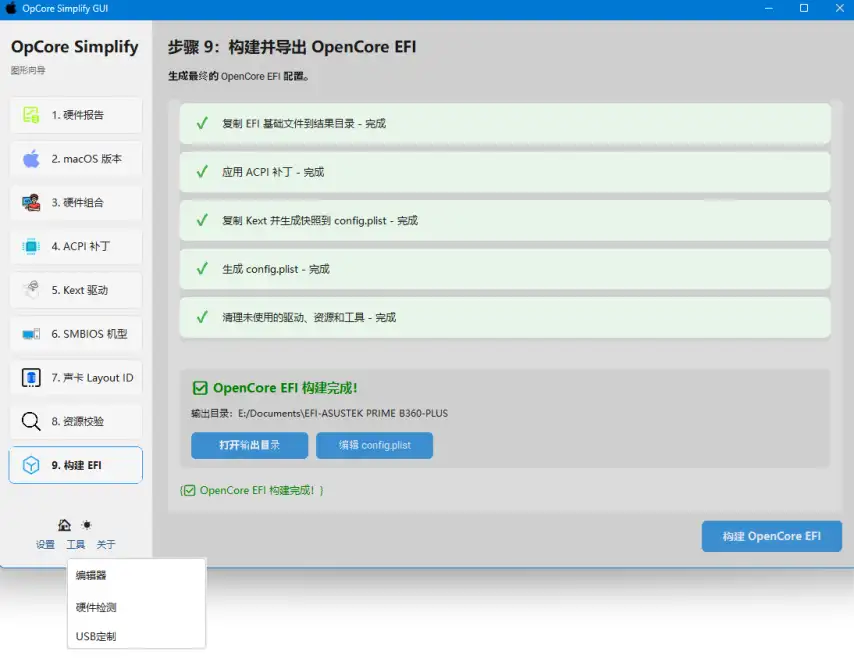 - 使用原版终端版本逻辑重写GUI,可选暗色/亮色主体,安装迭代模式逐步进行,也可以随时选择每一步内容,整体修改目的了然,最终完成构建OpenCore EFI的流程。