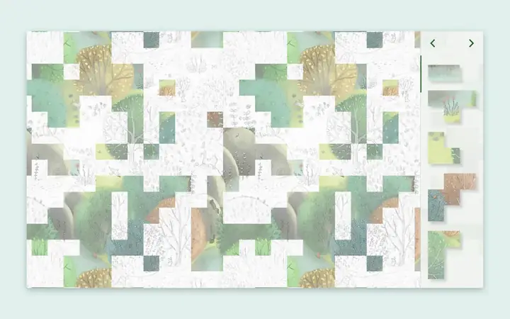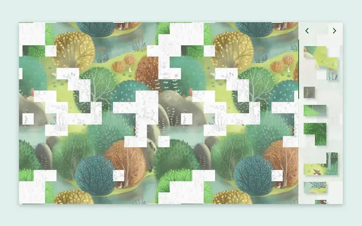 利用视觉线索,将杂乱的碎片拼成一幅图画。随着拼图的进行,图案会逐渐显现,细节和色彩也会越来越丰富。注意,图像会在屏幕边缘重复出现——这将有助于你更快地完成拼图。拼图完成后,图案将铺满整个屏幕。