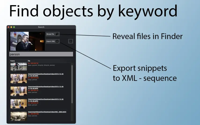 要进行搜索,请在“搜索”窗口中输入关键字;搜索将在您输入时执行。单击“显示文件”按钮即可在文件系统中找到找到的文件。您还可以立即播放找到所需对象的片段中的任何文件。所有找到的文件列表都可以导出为 XML 格式,以便随后导入到视频编辑应用程序中,从而将所有文件按所需时刻的顺序排列。这可以节省您在源文件中搜索镜头的大量时间!
