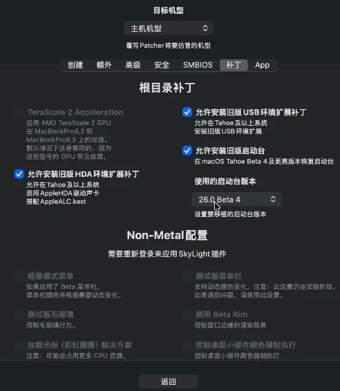 2.再安装OCLP-Mod,安装成功后在应用程序中找到并打开,,先点击设置,在补丁的选项下,选上 允许安装旧版USB环境扩展补丁,这也还有其他声卡与启动台的选项,按照个人需求选择,但对于USB网卡驱动,允许安装旧版USB环境扩展补丁,这项是一定要勾选上的,勾选上后返回主界面,选择安装驱动补丁