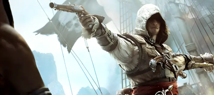 化身为勇敢叛逆的刺客爱德华·肯威,一位魅力四射却又冷酷无情的海盗船长,他曾接受过刺客组织的训练。爱德华熟练地使用刺客组织的袖剑以及包括双弯刀和一套四把手枪在内的新式武器。