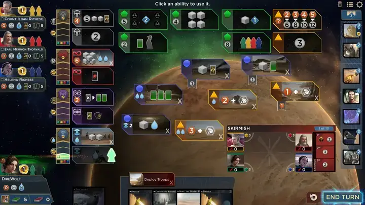 游戏共十轮,每轮都围绕着星球表面的一场全新冲突。部分冲突会提供关键资源,而其他冲突则会奖励胜利点数,助你最终称霸一方。但务必谨慎选择战斗:若兵力分散,敌人将变得过于强大,难以抵挡。