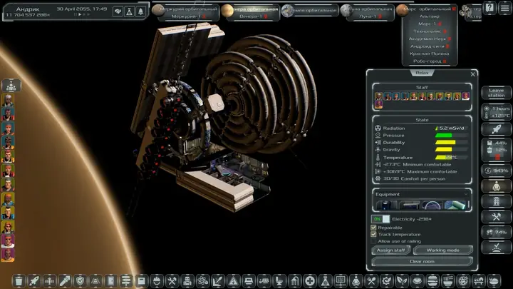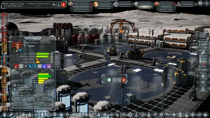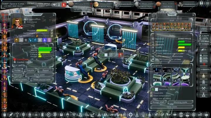 每位宇航员都是独一无二的个体,拥有各自的性格、世界观、专业技能和经验。随着经验和资历的增长,他们对体面的工资和舒适的生活条件的需求也随之增加。殖民者和所有人一样,需要满足基本需求:食物、睡眠、休息和个人卫生。必须特别关注殖民者的健康。及时治疗和照顾伤病员将确保他们的生存和福祉。