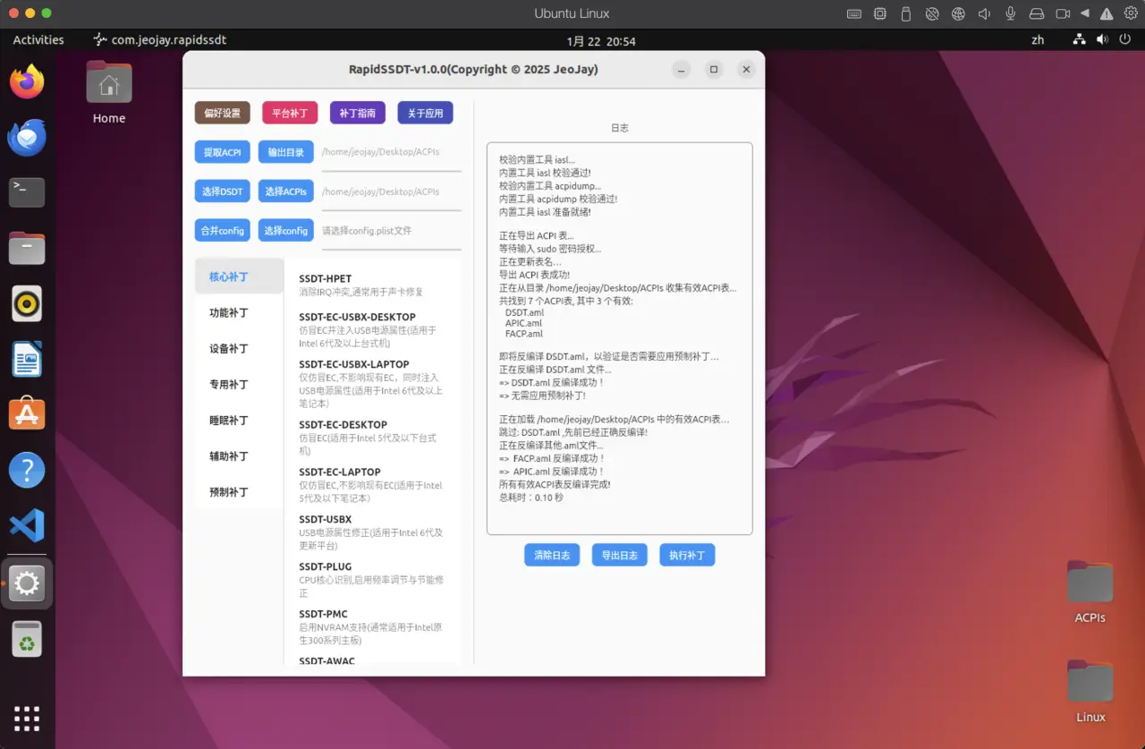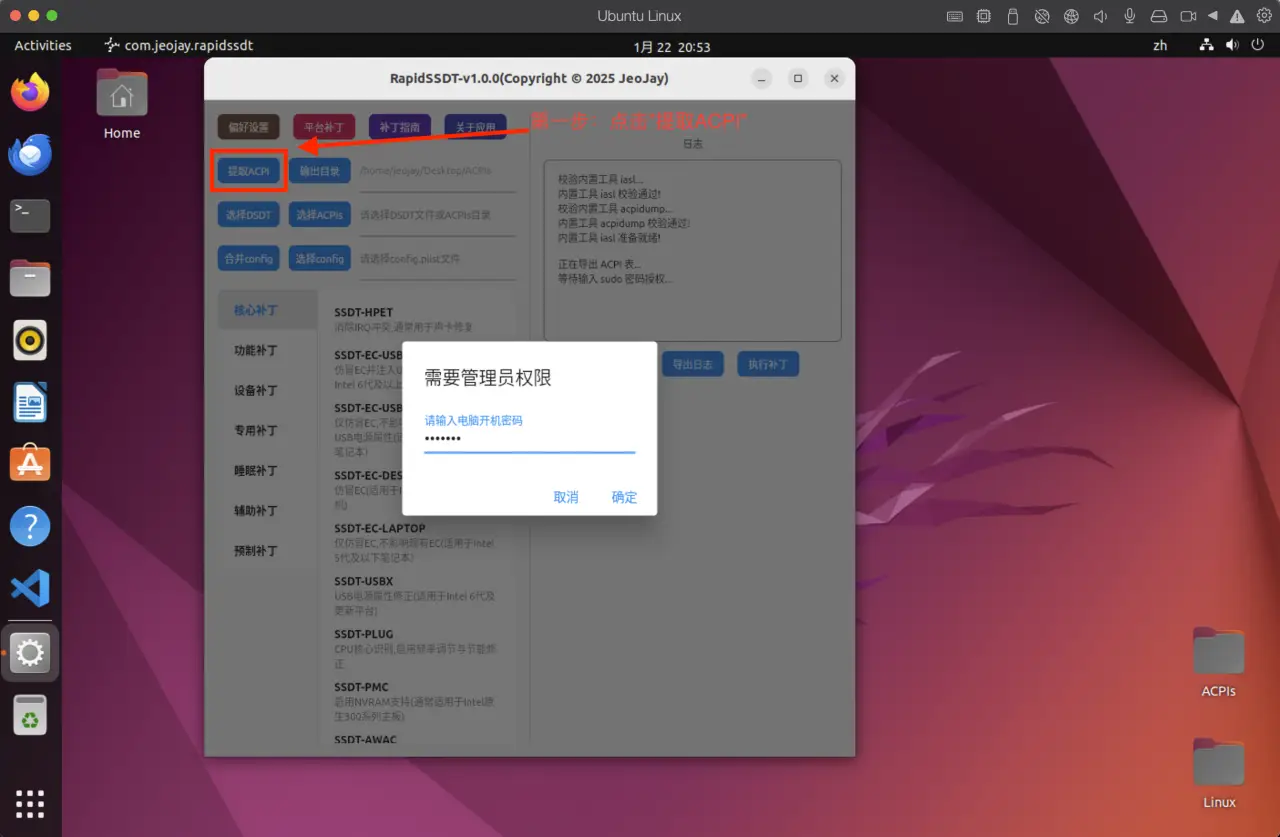 Linux下点击【提取ACPI】按钮,输入sudo密码后,即可提取本机的SSDT与DSDT.