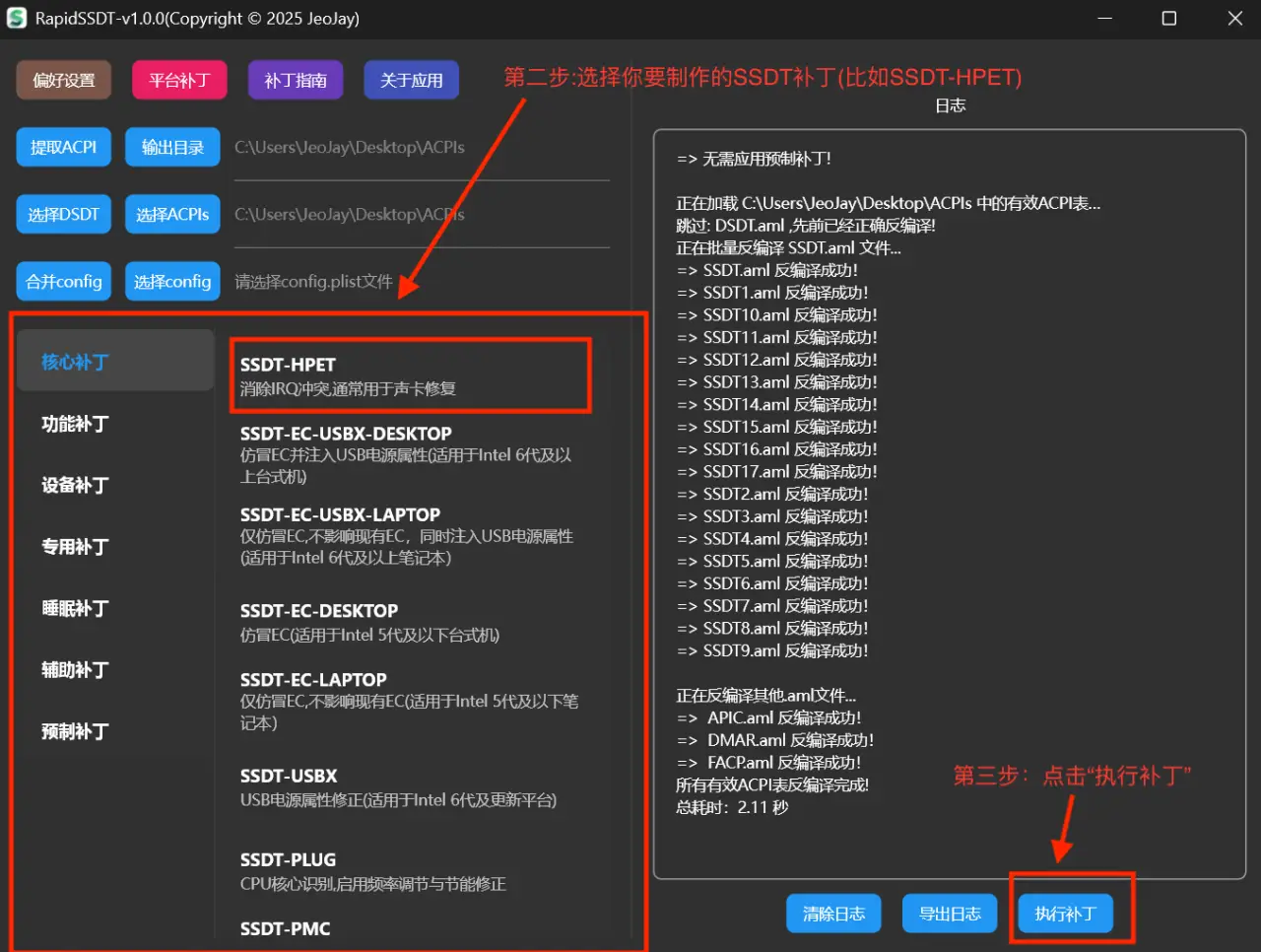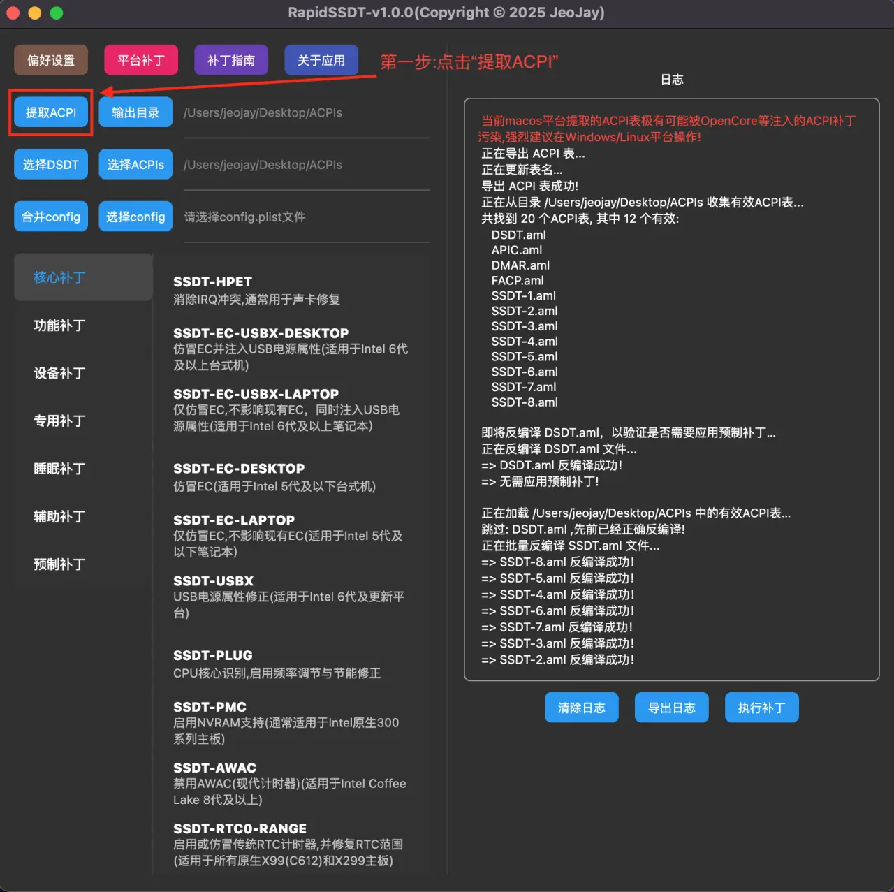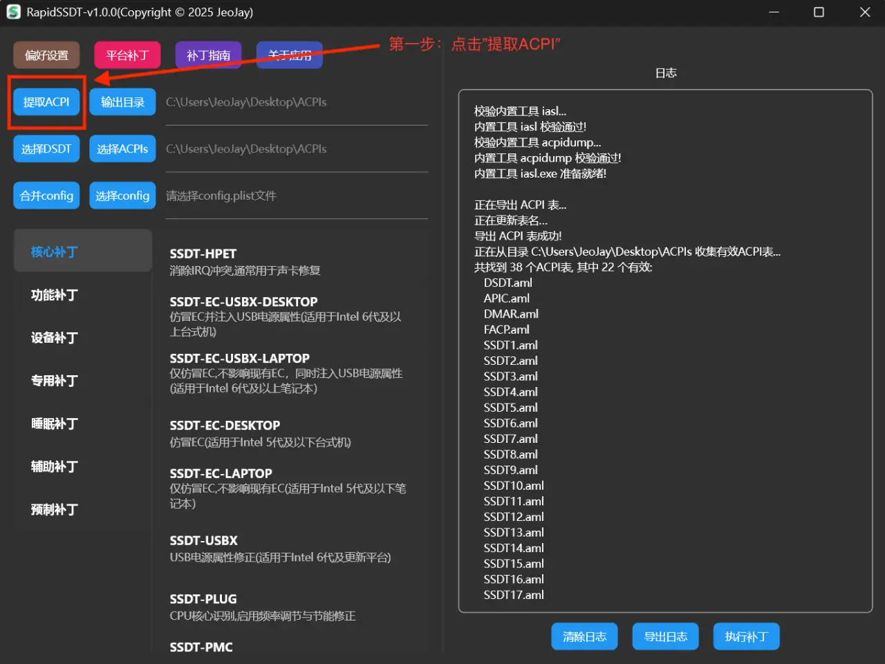 Win下提取完成后,默认输出在Desktop桌面ACPIs文件夹, 同时【选择ACPIs】路径这一块,会自动选择该文件夹,后续补丁操作都将基于该文件夹.无需手动选择!!!