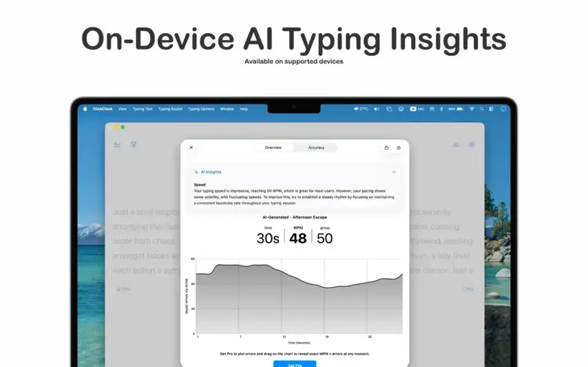 • 统计数据和进度。详细分析:速度(每分钟字符数)、准确率(%)、改进动态、误差图。