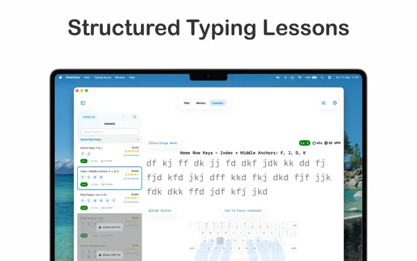 • 互动式学习。循序渐进的课程,难度逐渐增加:从基本按键到复杂组合和完整句子。