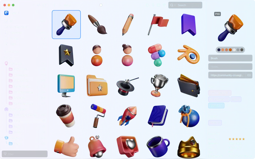 Eagle 帮助您在一个美观快捷的平台上收集、整理、搜索和使用数千张图片、屏幕截图、视频、字体、图标、模型、3D 模型、PSD、AI、Figma 文件、PDF 以及其他多种格式的文件。
