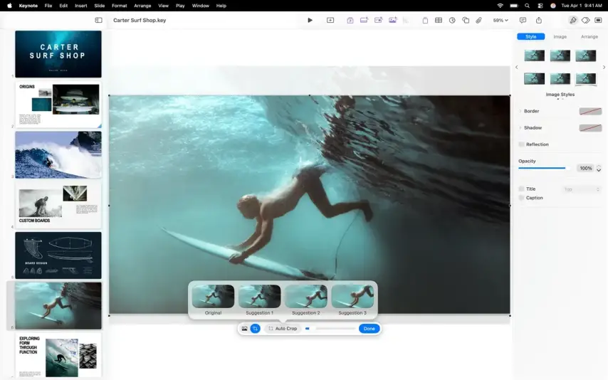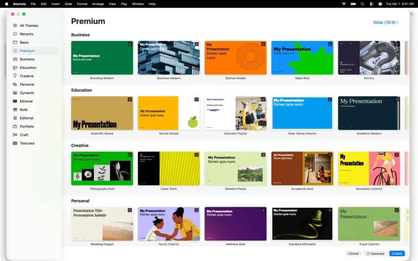 • 创建令人印象深刻的演示文稿。首先选择我们提供的 Apple 设计主题之一,然后添加文本、图像、图表和形状。