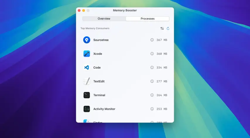 直接从菜单栏监控内存使用情况。无需打开应用程序,即可快速访问加速功能、详细统计信息和进程管理。