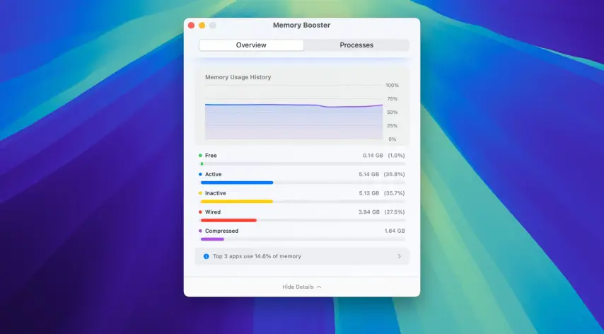 直接从菜单栏监控内存使用情况。无需打开应用程序,即可快速访问加速功能、详细统计信息和进程管理。