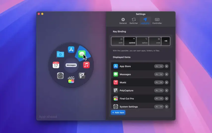 • 启动器 — 直接从环形菜单启动您喜爱的应用、文件夹、文件和文档。您可以添加任意数量的项目,并通过拖放进行排序。