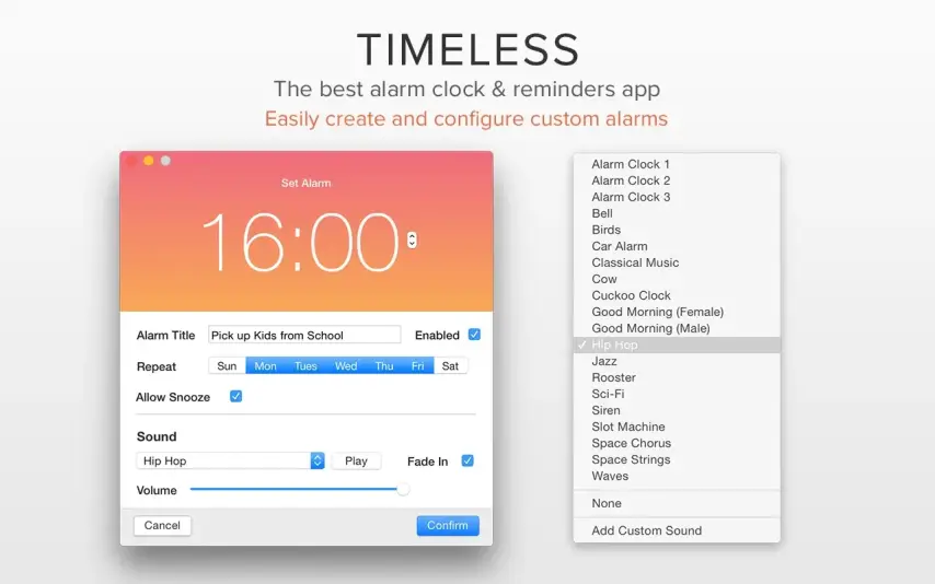 Timeless 是一款适用于 macOS 的优雅闹钟和提醒管理应用程序,它能够适应一天中的时间,并将您的 Mac 变成一款时尚的桌面时钟,并具有智能提醒功能。