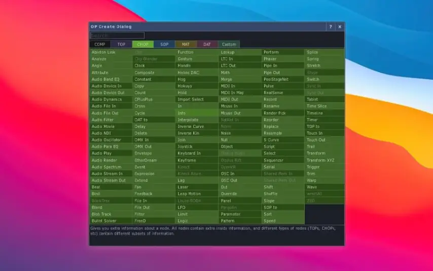 Touchdesigner 允许您在单一集成环境中创建应用程序核心和界面。您可以创建从简单的功能原型到完整的应用程序的任何内容。