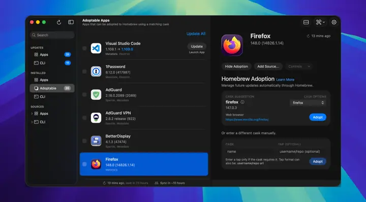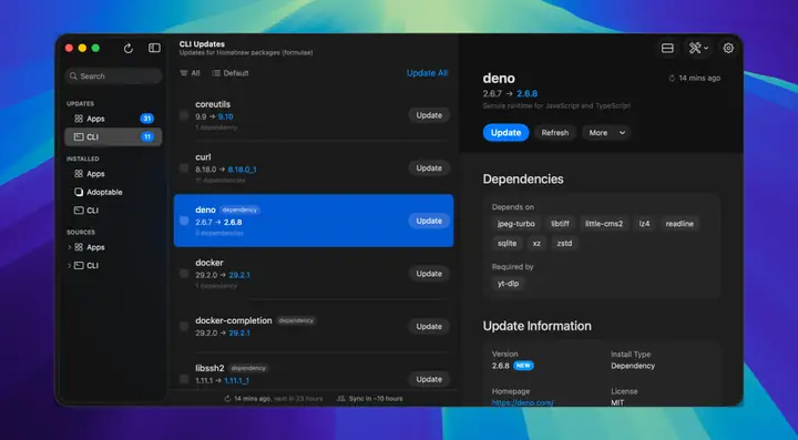 Updatest 是一款现代便捷的更新管理器,它将所有应用程序更新集中在一个地方,自动、安全地检查、下载和安装来自 Homebrew、Mac App Store、Sparkle、Electron 和 GitHub Releases 的更新,无需任何额外步骤。
