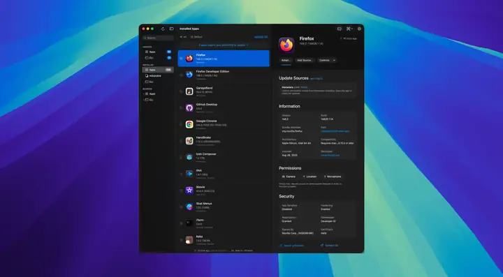 • 每个应用程序的详细信息:版本、大小、开发者、代码签名、公证、访问权限、下载链接