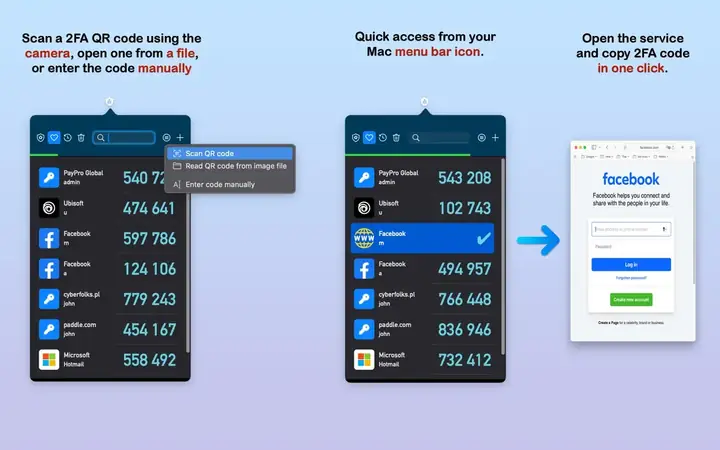 • 随时可用 - Mac 菜单栏中的图标可让您立即获取代码。只需点击所需的帐户,代码就会自动复制到剪贴板以粘贴到浏览器中。